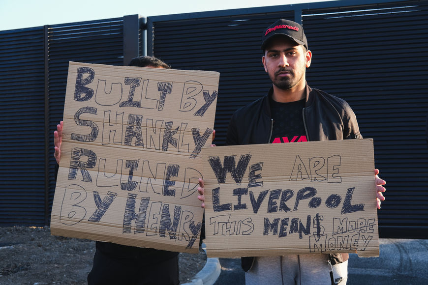 Liverpool FC Supporters with Homemade Signs 20/04/21